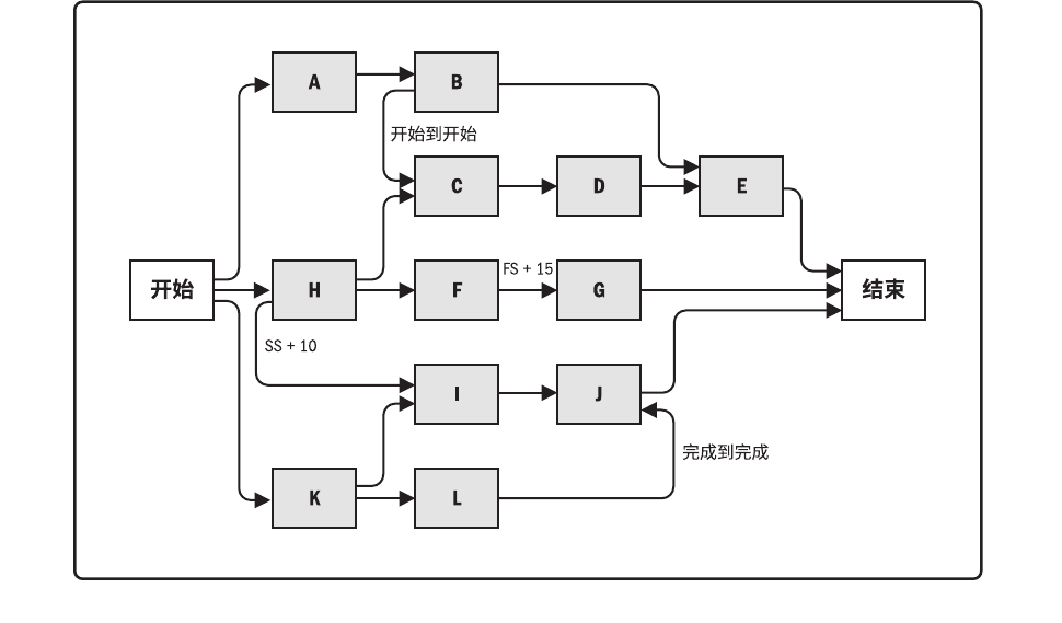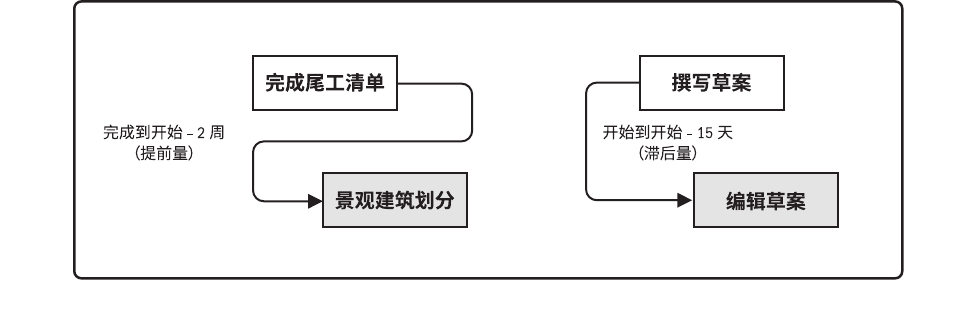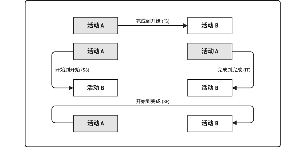 开始到完成(SF)。只有紧前活动开始,紧后活动才能完成的逻辑关系。例如,只有启动新的应付账款系统(紧前活动),才能关闭旧的应付账款系统(紧后活动)。