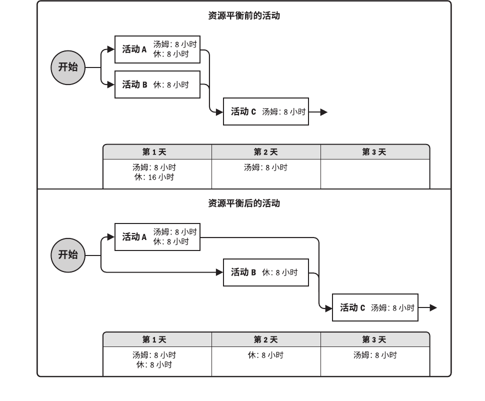 资源平衡。为了在资源需求与资源供给之间取得平衡,根据资源制约因素对开始日期和完成日期进行调整的一种技术。如果共享资源或关键资源只在特定时间可用,数量有限,或被过度分配,如一个资源在同一时段内被分配至两个或多个活动(见图 6-17),就需要进行资源平衡。