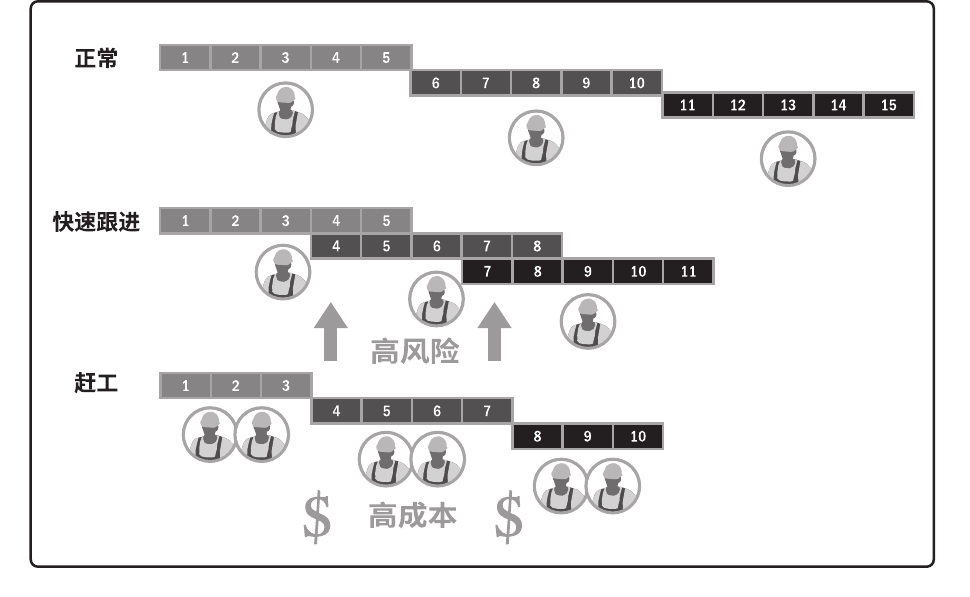 赶工。通过增加资源,以最小的成本代价来压缩进度工期的一种技术。赶工的例子包括:批准加班、增加额外资源或支付加急费用,来加快关键路径上的活动。赶工只适用于那些通过增加资源就能缩短持续时间的,且位于关键路径上的活动。但赶工并非总是切实可行的,因它可能导致风险和/或成本的增加。