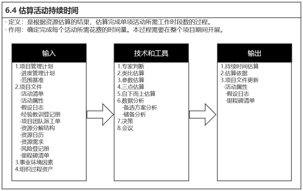 如果无法以合理的可信度对活动持续时间进行估算,则应将活动中的工作进一步细化,然后估算具体的持续时间,接着再汇总这些资源需求估算,得到每个活动的持续时间。