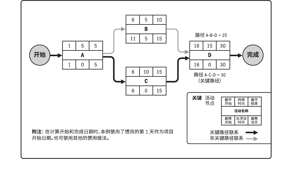 如图所示。在这个例子中,最长的路径包括活动 A、C 和 D,因此,活动序列 A - C - D 就是关键路径。关键路径是项目中时间最长的活动顺序,决定着可能的项目最短工期。最长路径的总浮动时间最少,通常为零。由此得到的最早和最晚的开始和结束日期并不一定就是项目进度计划,而只是把既定的参数(活动持续时间、逻辑关系、提前量、滞后量和其他已知的制约因素)输入进度模型后所得到的一种结果,表明活动可以在该时段内实施。关键路径法用来计算进度模型中的关键路径、总浮动时间和自由浮动时间,或逻辑网络路径的进度灵活性大小。