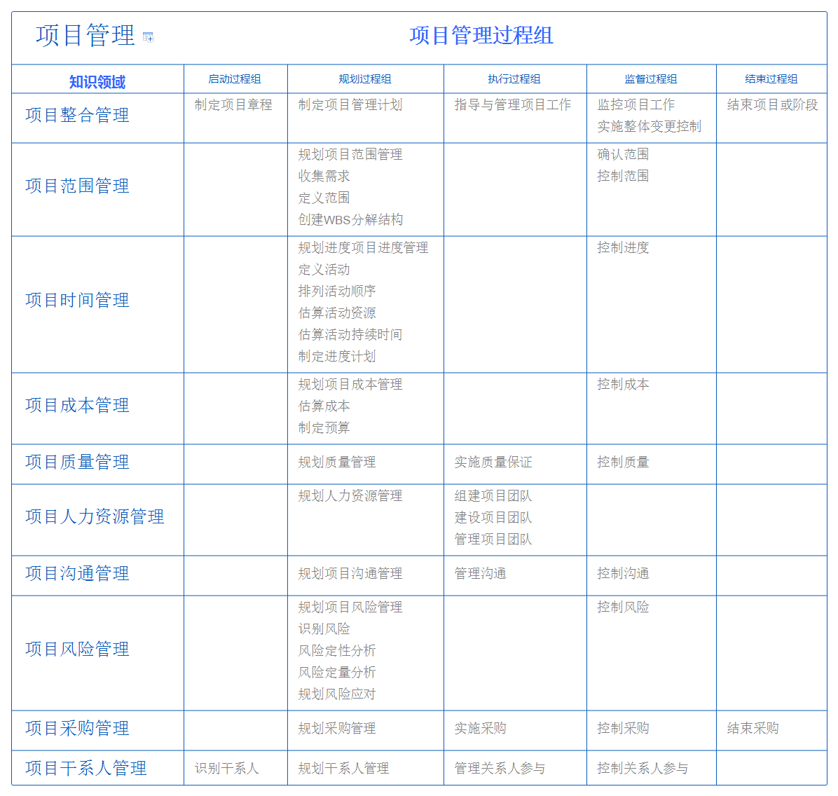 在pmp理论体系中,10大知识领域是pmp项目管理理念的核心。但pmp中的项目管理是广义上的项目管理,不仅仅是我们程序员眼中的软件项目,如传统行业中的汽车工程,建筑项目,电力项目等等,都在pmp的项目理念中。以下是10大知识领域表格。