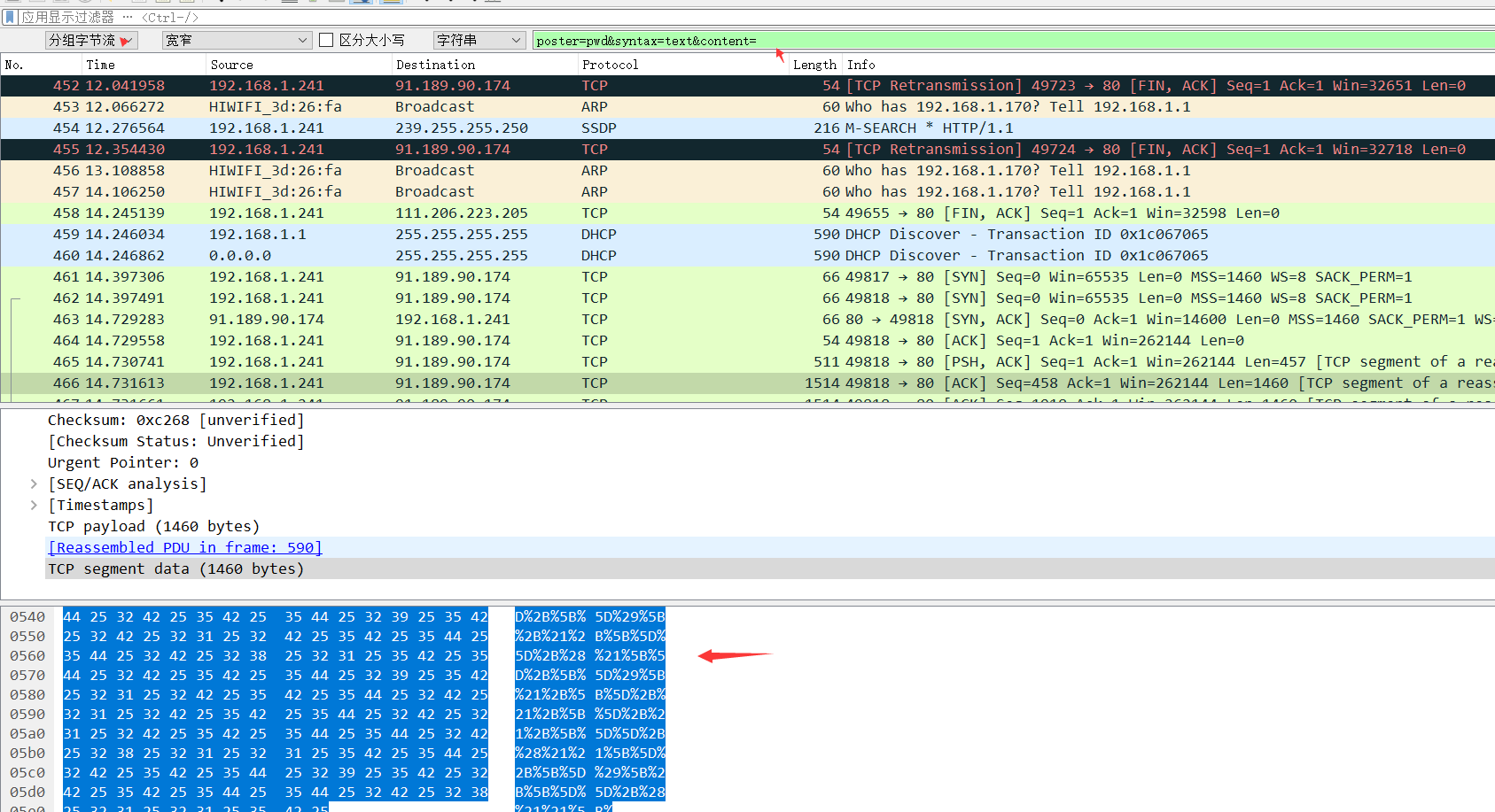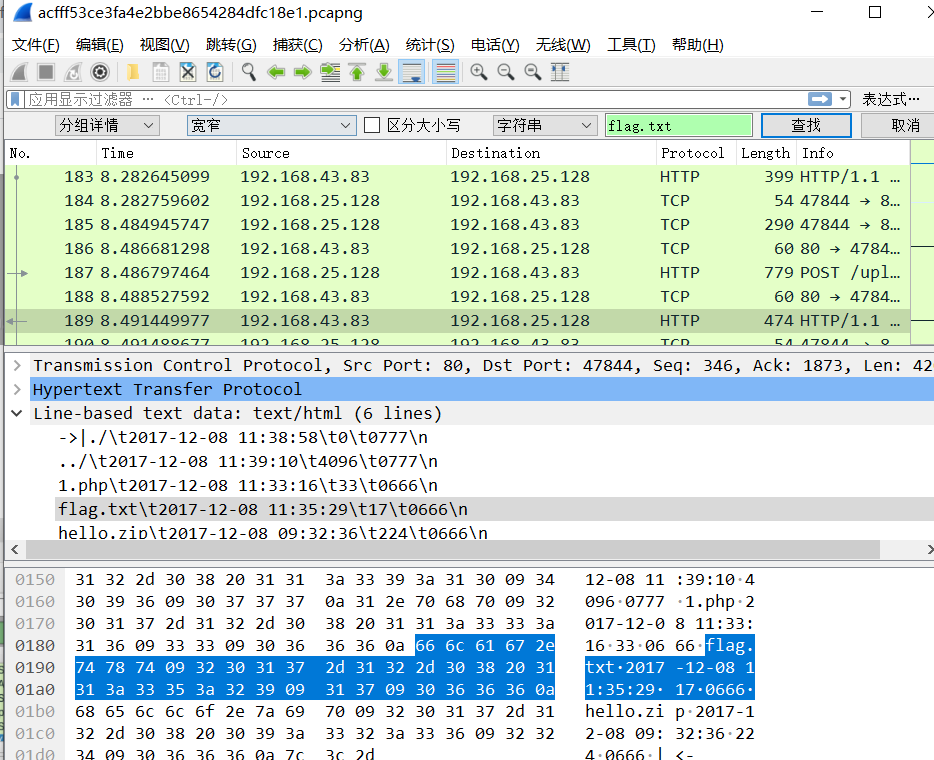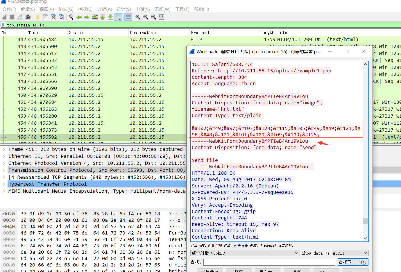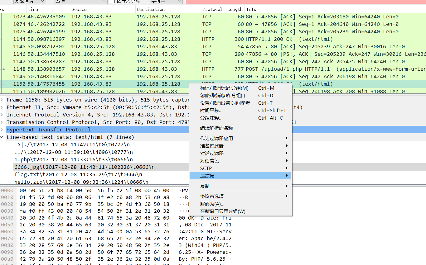 1.通过wireshark打开流量文件,并通过过滤post数据包 http.request.method =="POST",可以看到upload/example1.php