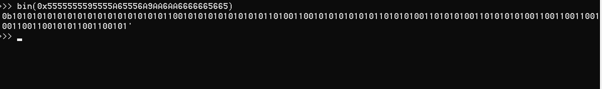 >>>bin(0x5555555595555A65556A5A96AA666666A955)