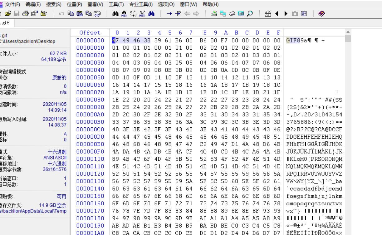 gif图像开始标志:47 49 46 38 39 61 结束标志:01 01 00 3B