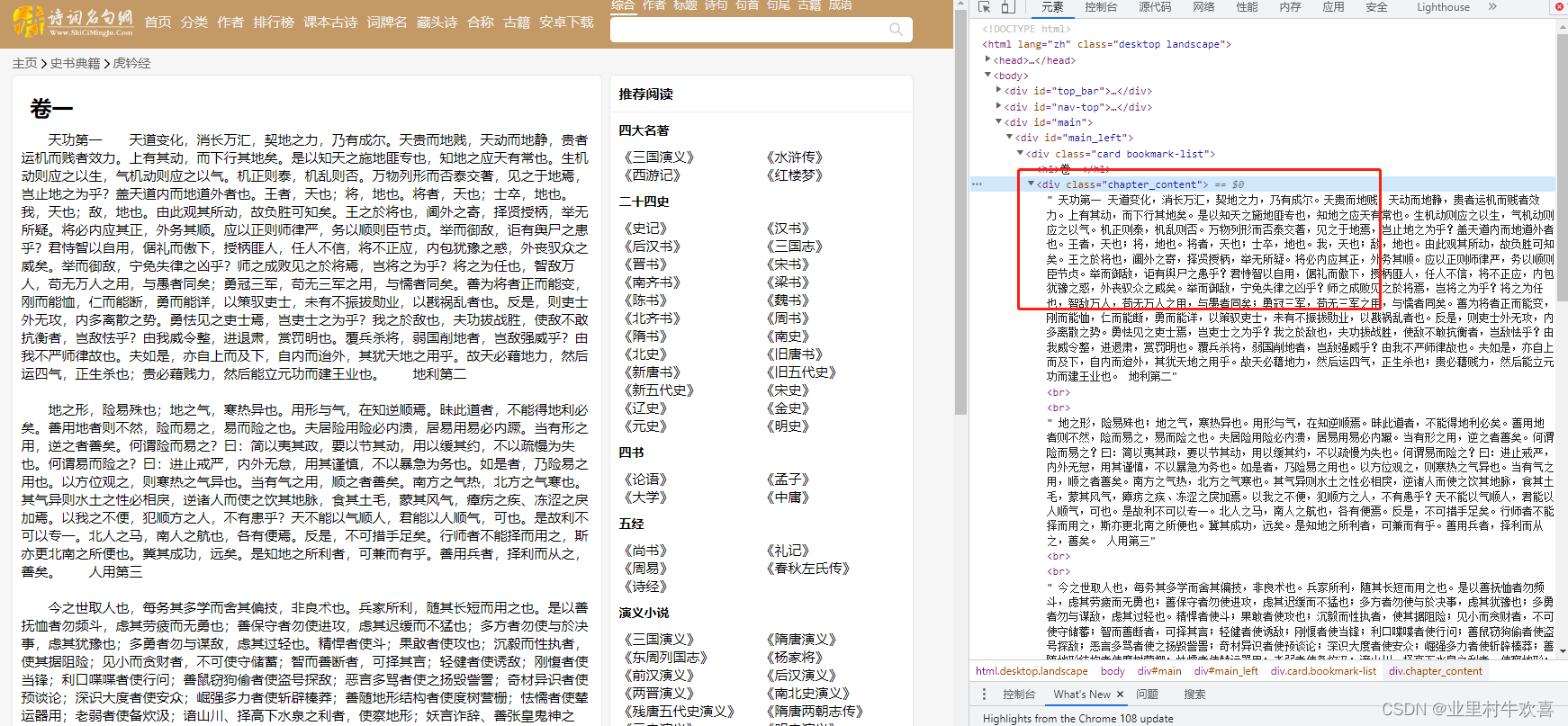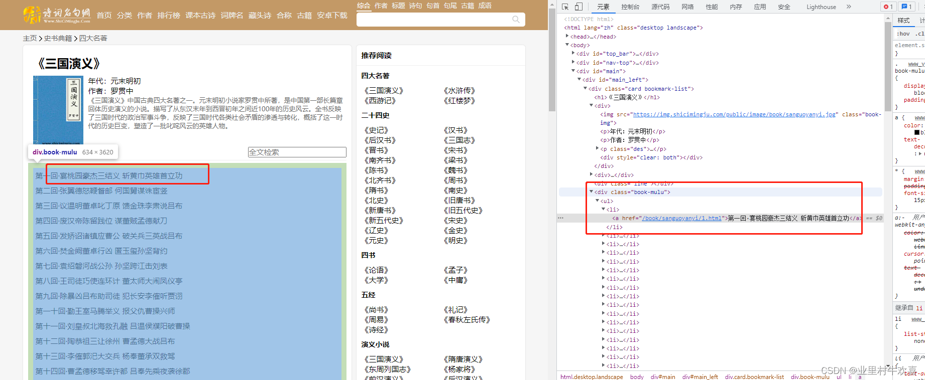 通过bs模块可以抓取到网站源代码的数据,然后分析抓取网站代码架构。首先可以看到网站每一章的标签都是div class="book-mulu"标签下面,只要搜索到标签值就可以抓到里面数据。