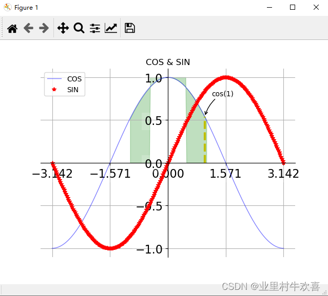 plt.plot([t,t],[0,np.cos(t)],"y",linewidth=3,linestyle="--")#注释添加黄线