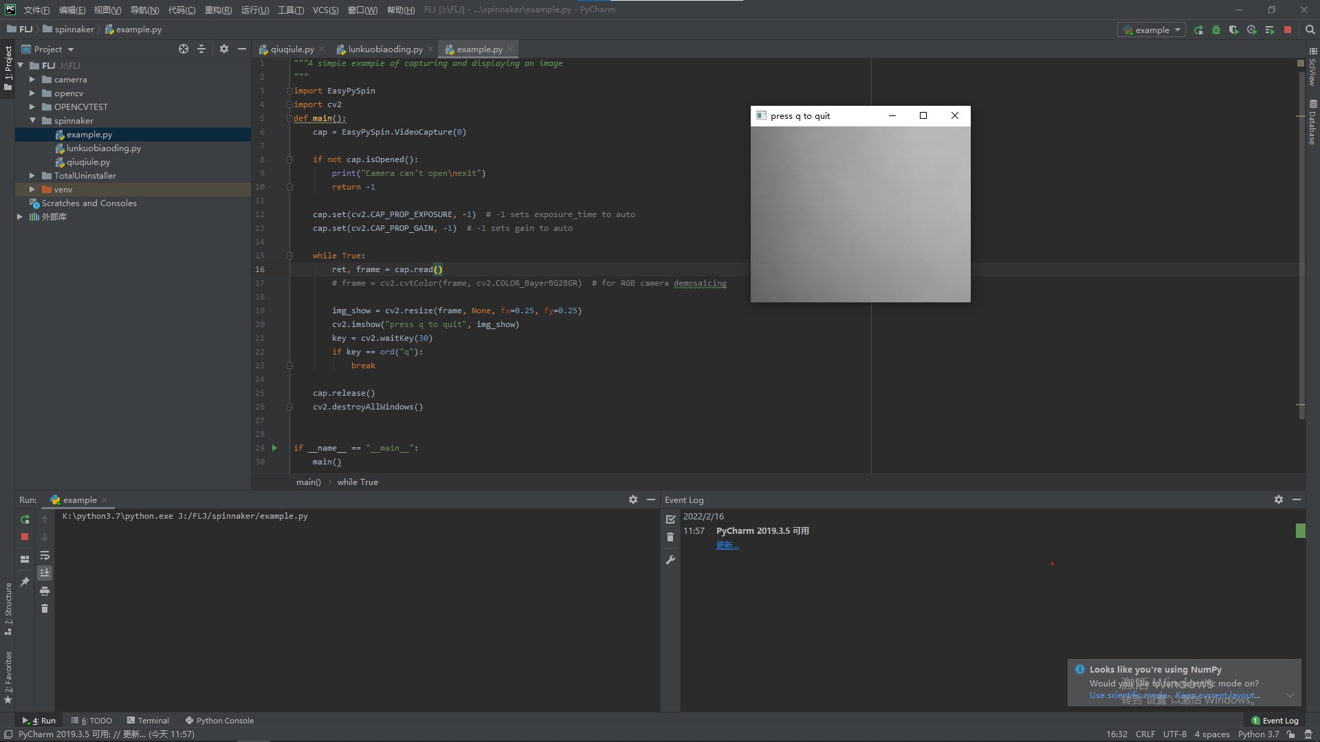 以上就是魁梧纸鹤最近收集整理的关于[POINTGREY]工业相机——基于python,opencv,spinnaker的开发1.Spinnaker SDK2.Pycharm+Python的环境(可自行配置)3.EasyPySpin库4.PySpin5.运行Example程序的全部内容,更多相关[POINTGREY]工业相机——基于python,opencv,spinnaker的开发1.Spinnaker内容请搜索靠谱客的其他文章。