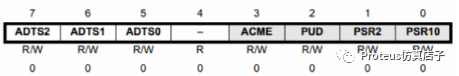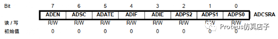 5-7位:这3位的设置是当ADCSRA中的ADATE位置1才有效,被选中的中断在上升沿时触发ADC转换(本案例例程不做该功能,了解一下)。