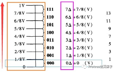 如图,0-1V是连续的电压量,而0-0.125V被当做0△,那么就会存在最小误差△;接着通过一定的编码方式转换,如二进制、八进制、十六进制等。
