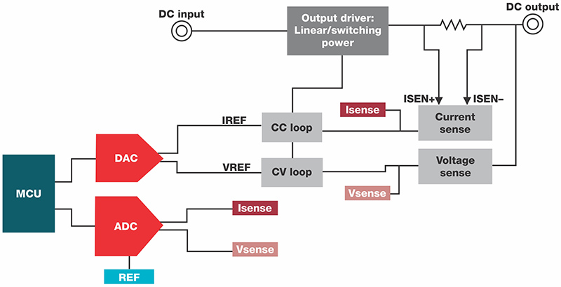 图1是电源的方框图 包括输出驱动器、电流和电压传感电路、 控制回路、模数转换器(ADC)和数模转换器(DAC)。