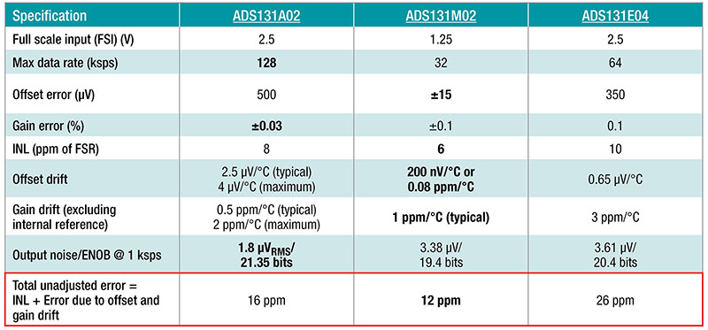ADS131M02在表中列出的adc中错误最小。 误差计算不包括ADC的输出噪声和电压参考误差。