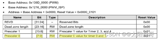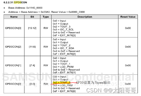 GPD0CON[0] [3:0]-------0x2(GPIO设置为PWM输出)