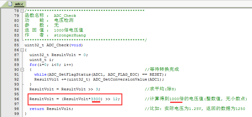 调用这个接口就可以采集电压值。这里采样8次(根据自己情况可以选择平均多次),算平均,最后得出电压值(1000倍值)。1000倍数值是不想有小数点,方便打印输出。