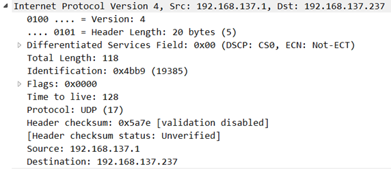 - 上层协议标识:1:ICMP,2:IGMP、6:TCP、17:UDP等;