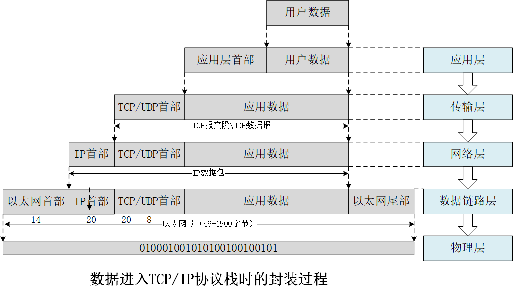 数据进入TCP/IP协议栈时的封装过程如下:
