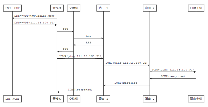 - 然后路由1 经过路由协议,经过一个个路由的转发,最后发送到了百度的主机上。百度主机检测到 IP 是自己的 IP,接收并处理 Ping 请求,接着百度主机发送一个 Ping 回应报文给开发板。