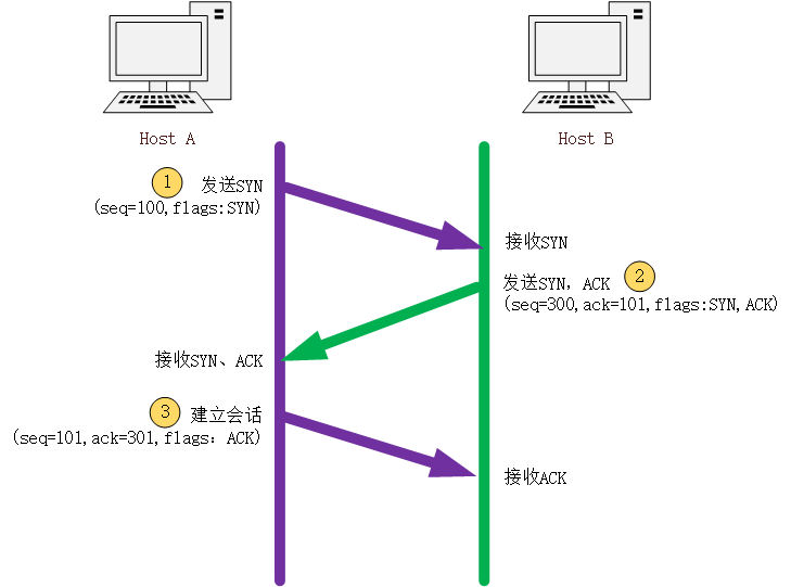 - SYN:用于建立TCP连接时同步序列号