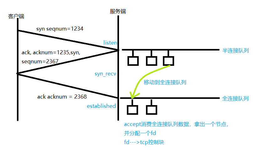 第一次握手完成时,服务端从IP头、TCP头获取到源IP、目的IP、源端口、目的端口、协议等信息构成五元组,存到半连接队列节点中;当第三次握手完成,遍历半连接队列找到对应的节点,并把节点移动到全连接队列中,应用层调用accept消费全连接队列数据,并分配fd,全连接队列每个节点可以叫tcp控制块,fd与tcp控制块一一对应。