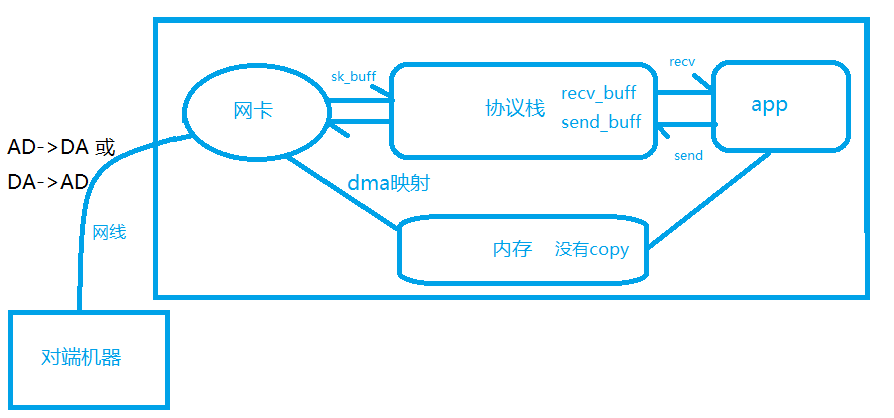 正常的流程是网卡接收到数据后,把数据copy到协议栈(sk_buff),协议栈把sk_buff数据解析完后再把数据放到recv_buff,此时应用程序调用recv把数据从协议栈copy到应用程序;发送数据包,则与之相反,应用程序调用send把数据包copy到send_buff,协议栈从send_buff取数据放到sk_buff,交给网卡发送出去。这个过程有多次拷贝,为避免多次拷贝,使用dma的方式(零拷贝),把网卡的数据直接映射到内存,再由应用程序访问内存。