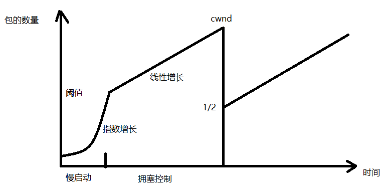 一开始数量是指数级增长(慢启动),到达初始化的阈值后线性增长,增长到对方接收数据时,回ack的包超过RTT时间,这时网络拥塞,数据包太多来不及处理,此时降一半。