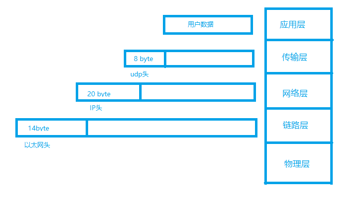 由上图可知,以太网头属于链路层、IP头属于网络层、UDP头属于传输层,而实际的用户数据在应用层。