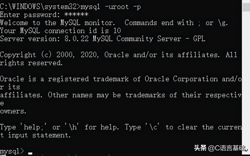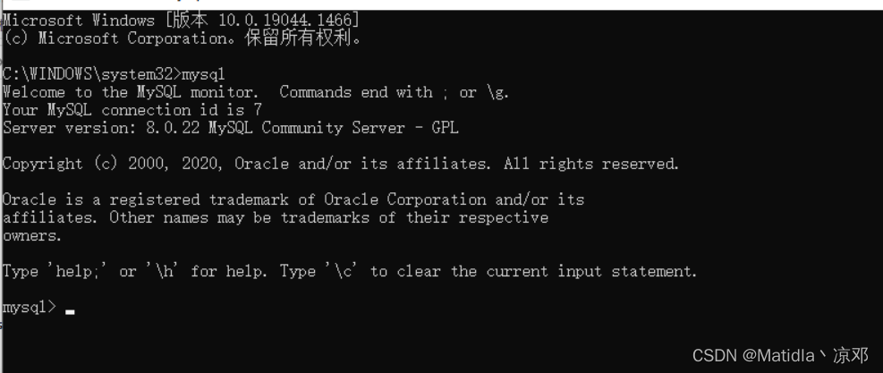 马上重新打开!!!!! 重新打开一个cmd窗口(用管理员权限) 然后输入mysql如果成功 就会出现如下图所示