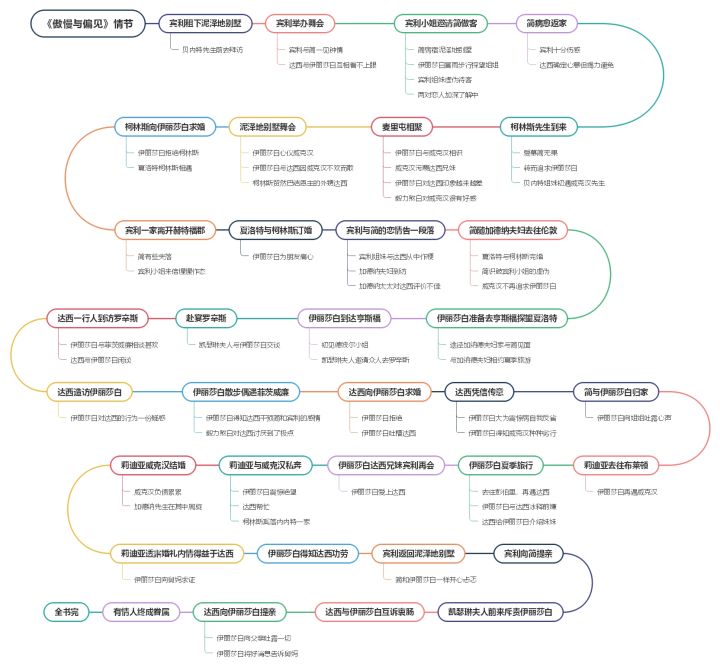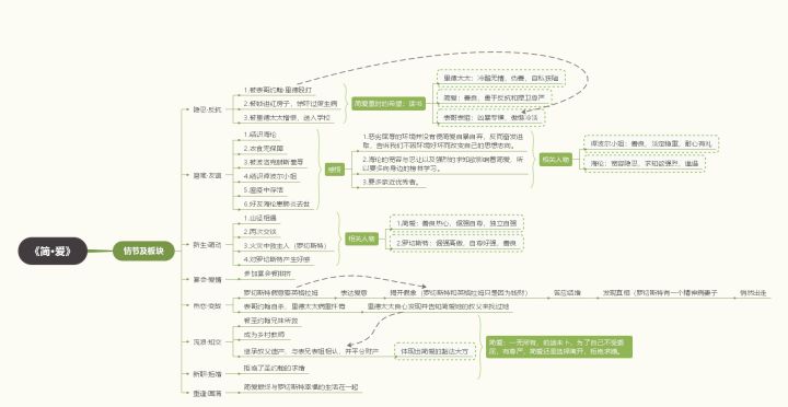 情节是小说中另一个非常重要的元素,相对人物会更加复杂,更有梳理的必要性。例如推理小说每个情节环环相扣,通过对情节抽丝剥茧能够挖掘出真相。情节串联人物,人物推动情节。有关情节的思维导图可以以时空为线索或者以人物为线索,或者其他。