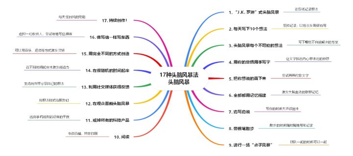 以上导图例举了17种头脑风暴法,尝试多种方法可能会有意外收获。