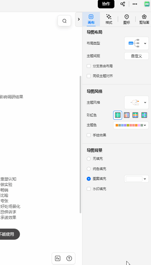 在亿图脑图协同版中,右侧面板直接“藏”了起来(绘图区域变得更大),取而代之的是浮动工具栏。当你选中主题时,系统就会在符号周围唤起浮动工具栏,支持添加子主题、同级主题、变更线条颜色、线框颜色、主题形状等快捷操作。