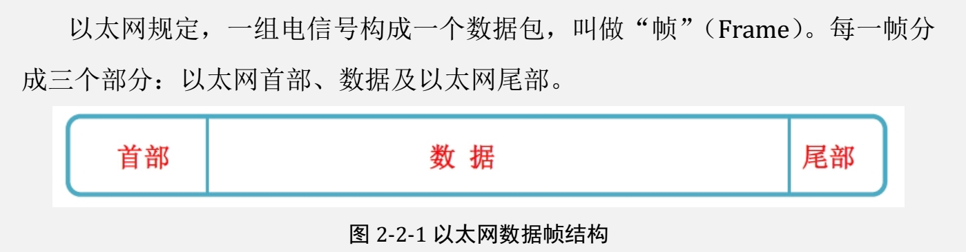 “以太网首部”包含数据帧的一些说明项,比如发送者、接收者、数据类型等等;“数据”部分则是数据的具体内容;“以太网尾部”则是 CRC 校验码。“以太网首部”的长度固定为 14 字节。“数据”的长度,最短为 46 字节,最长为 1500 字节。“以太网尾部”的长度固定位 4 字节。因此,整个“帧”最短为 64 字节,最长为 1518 字节。如果数据很长,就必须分割成多个帧进行发送
