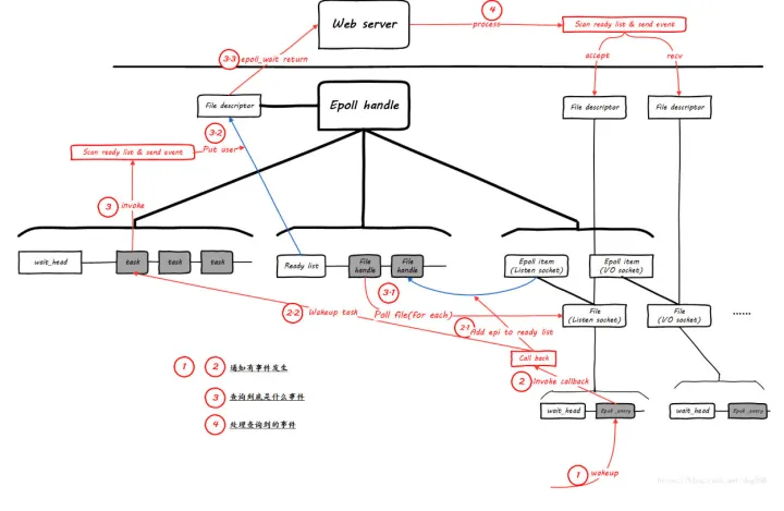 图中的一个 epoll 的 sleep/wakeup 流程如下: