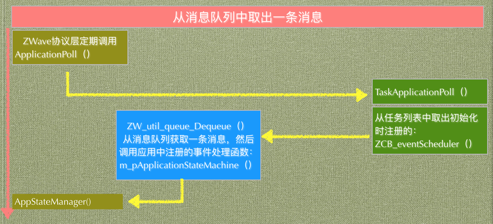 在这个函数中,我们可以直接去消息队列中取出一个消息。但是如果这么做的话,就浪费了 ZWave 为我们提供的 Task 机制,因此这里调用了 TaskApplicationPoll( ),然后我们应用层的事件处理函数 AppStateManager( ) 就老老实实的待着,等待别人把事件消息准备好、喂过来。
