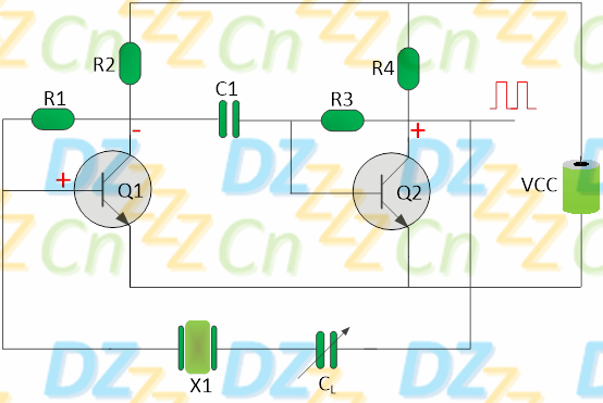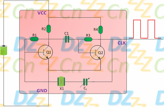 晶体本身是不能产生振荡信号的,必须借助于相应的外部振荡器电路才能实现,下图是一个串联型振荡器电路,其中,晶体管Q1、Q2构成的两级放大器,石英晶体X1与电容CL构成LC电路。在这个电路中,石英晶体相当于一个电感,CL为可变电容器,调节其容量即可使电路进入谐振状态,输出波形为方波。