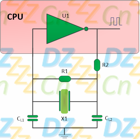 上图中,U1为增益很大的反相放大器,CL1、CL2为匹配电容,是电容三点式电路的分压电容,接地点就是分压点。以接地点即分压点为参考点,输入和输出是反相的,但从并联谐振回路即石英晶体两端来看,形成一个正反馈以保证电路持续振荡,它们会稍微影响振荡频率,主要用与微调频率和波形,并影响幅度。 X1是晶体,相当于三点式里面的电感