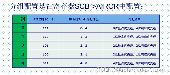 eg:抢占优先级占前1位,那么响应优先级就占后3位,如果设置为1101,那么抢占优先级就是1,响应优先级就是101,十进制就是5,这叫“分组配置”,而这四位的分组由SCB->AIRCR控制,是SCB寄存器的8~10位: