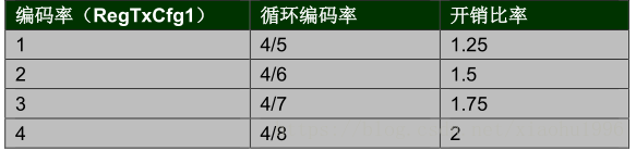 为进一步提高链路的鲁棒性,LoRa TM 调制解调器采用循环纠错编码进行前向错误检测与纠错。使用这样的纠错编码之后,会产生传输开销。每次传输产生的数据开销见下表。
