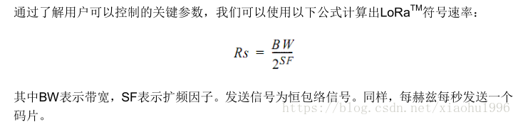 LoRa TM 扩频调制技术采用多个信息码片来代表有效负载信息的每个位。扩频信息的发送速度称为符号速率(Rs),而码片速率与标称符号速率之间的比值即为扩频因子,其表示每个信息位发送的符号数量