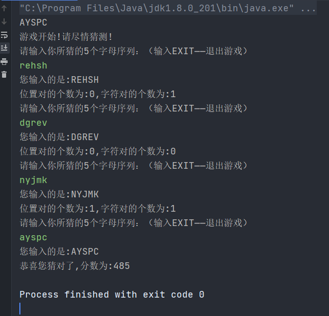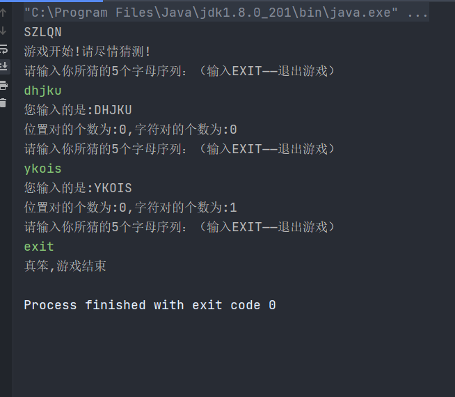 System.out.println("请输入你所猜的5个字母序列:(输入EXIT——退出游戏)");