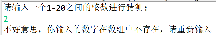 - 未猜中提示:“不好意思,你输入的数字在数组中不存在,请重新输入”,并继续猜测;