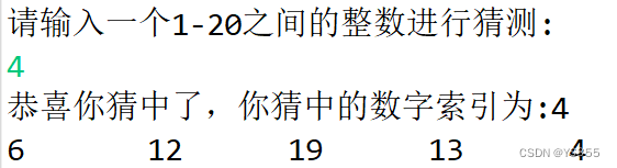 - 猜中提示:“恭喜你猜中了”,并输出该数字第一次出现的索引位置,且输出全部的5个数据,最终结束本游戏;