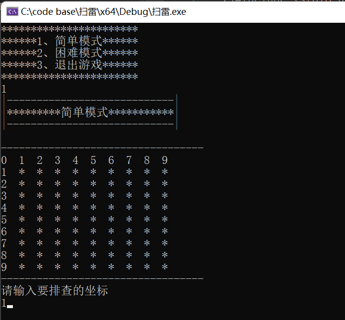 void FindMine(char mine[ROWS][COLS], char show[ROWS][COLS], int row, int col,int MINE) { int x = 0; int y = 0; int win = 0; while (win<ROW*COL-MINE) { printf("请输入要排查的坐标n"); scanf("%d%d", &x, &y); if (x >= 1 && x < col && y>=1 && y < row) { if (mine[x][y] == '1') { printf("|----------------------------|n"); printf("|*****很遗憾,你被炸死了******|n"); printf("|----------------------------|n"); DisplayBoard(mine, ROW, COL); break; } else { //如果不是雷,统计周围有几个雷 int count = GetMyCount(mine, x, y); show[x][y] = count + '0'; DisplayBoard(show, ROW, COL); win++; } } else { printf("输入的坐标有误n"); } } if (win == ROW * COL - MINE) { printf("恭喜你,通关了!n"); } }思路:设置一个循环,当排雷的次数小数没有地雷坐标个数时,循环就会继续