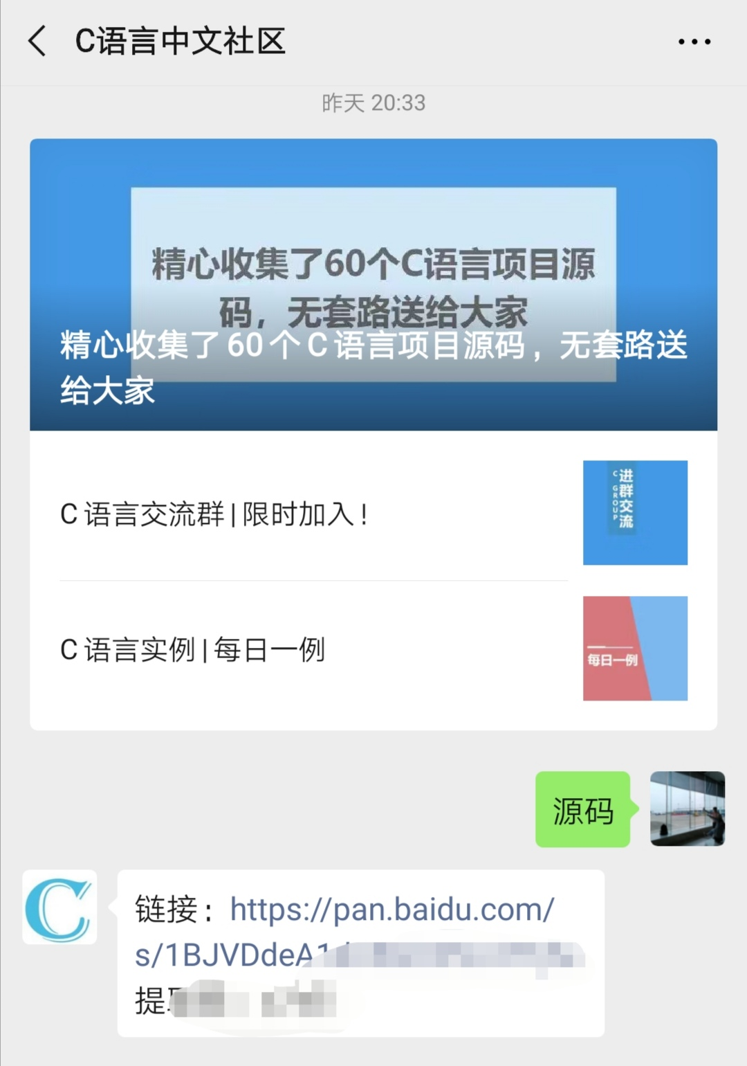 在微信公众号【C语言中文社区】直接回复“源码”两个字