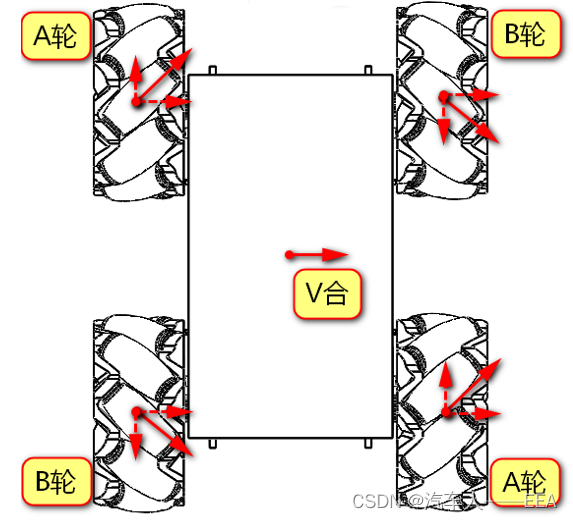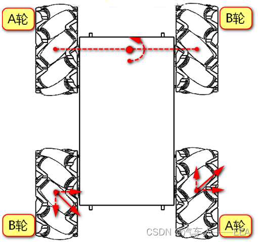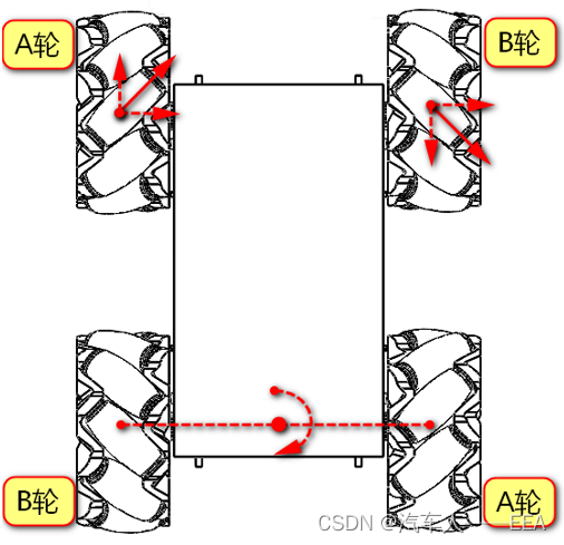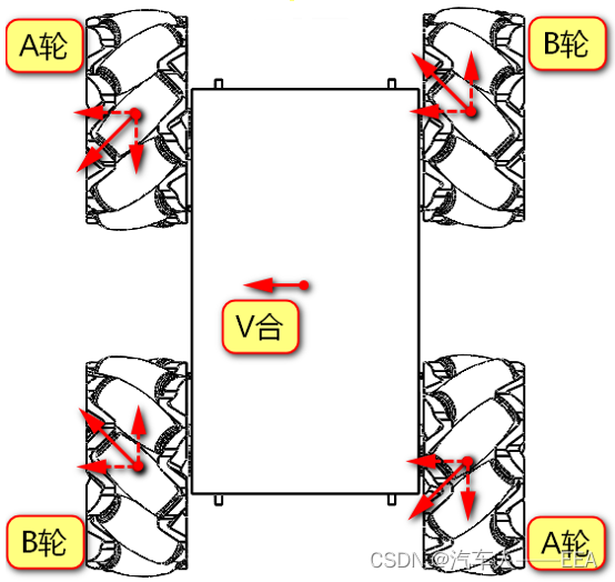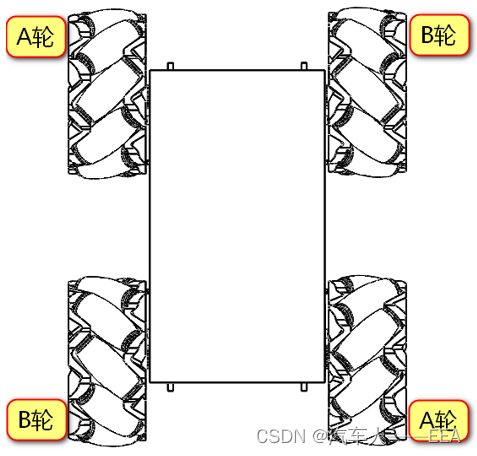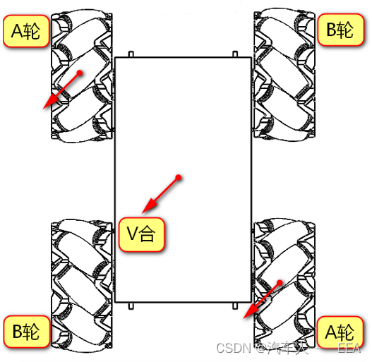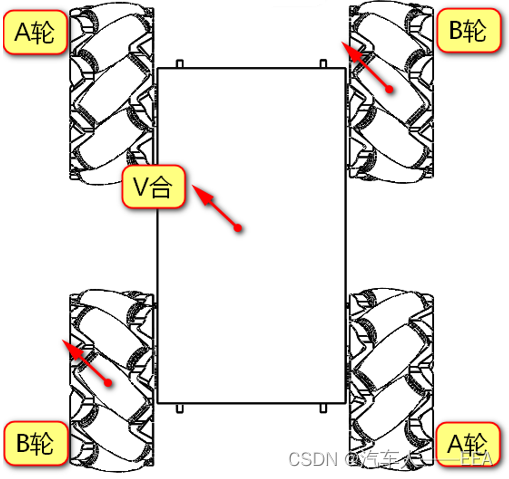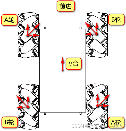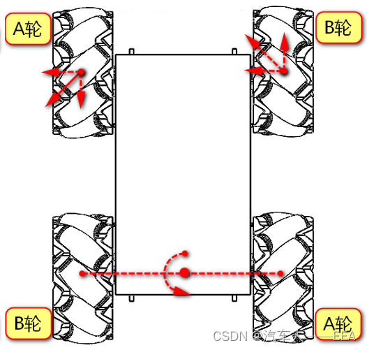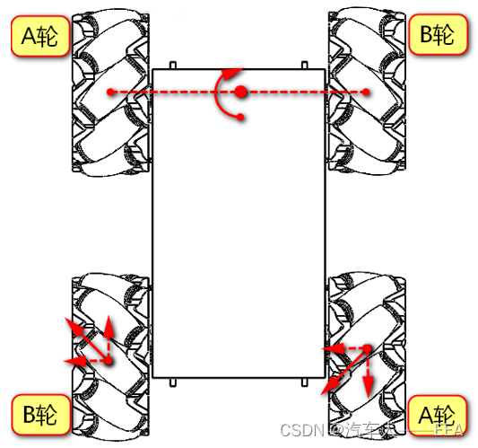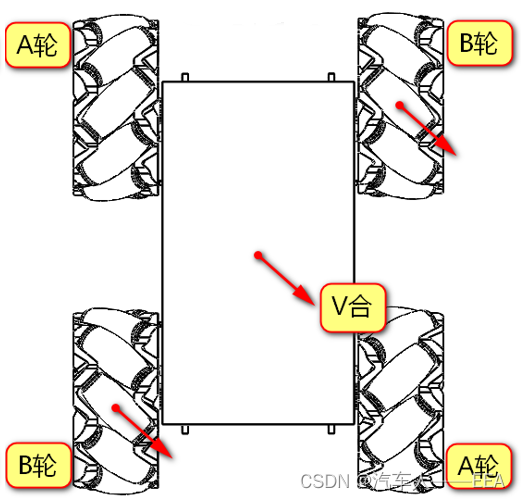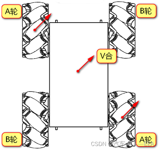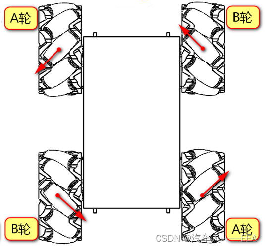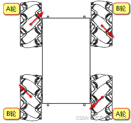 | 运动方向 | 左前——A轮 | 右前——B轮 | 左后——B轮 | 右后——A轮 |
