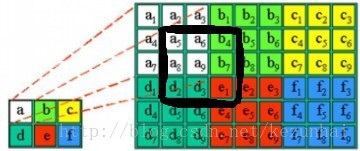 通 过上式的更新方式,我们可以看到,如果一个像素被判为背景,那么其邻域像素也会被更新,其邻域像素的背景模型也会被该像素影响,使邻域的信息进一步融入模型中,使得算法具有了邻域空间相关性。这里我继续通过上面的映射图来进一步解释:假设a位置的像素与背景模型中的a9最匹配,即其距离满足上面的最小距离度量方式,那么背景模型中对应于(a5,a6,b4,a8,a9,b7,d3,e1,e3)将被更新,更新位置如下图所示(即图中黑色框框出来的像素将被更新,更新模型中包括了邻域的背景像素,随着算法的继续执行,那么邻域之间的信息将被更好的融合):