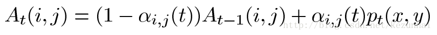 ② 如果当前像素被判为背景,且其与对应背景模型C中的cm最匹配(假设对应位置为(x',y')),即上式中的距离最小, 则其权重采用下式进行更新: