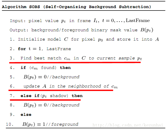 经过测试,算法性能表现不错,对光照也有较强的鲁棒性,另外计算速度还可以,对于352×288的图像来说,处理速度可以达到15-20fps(应个人主机而异)。但是有些许不足的是,该算法中的每个像素都要与背景模型中的n×n个像素背景求最小值,这在一定程度上影响了处理速度(但这又与背景模型的更新紧密关联,能否采用类似VIBE算法中的度量方式,只要满足#min,则判为背景,然后选用另外的更新方式,处理速度上应该有所提高)。另外,作者与此相关的一篇论文:The SOBS algorithm- what are the limits,有兴趣的读者可以下下来看看。下面给出论文的伪代码: