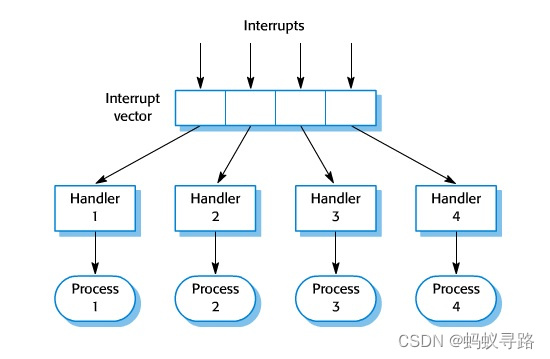 中断驱动的控制模型如图2所示。已知中断类型的数量,每种类型都定义了一个处理程序。每种类型的中断都与存储其处理程序地址的内存位置相关。当接收到特定类型的中断时,硬件开关将导致控制立即转移到其处理程序。然后,该中断处理程序可以响应于该中断所通知的事件来启动或停止其他进程。
