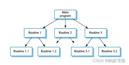 调用返回模型如图1所示。主程序可以调用例程1、2和3;它们可以调用例程1、2和3。例程1可以调用例程1.2或1.2;例程3可以调用例程3.1或3.2;等等。这是程序动力学的模型。它不是结构模型;它不是结构模型。例如,无需将例行程序1.1纳入例行程序1。