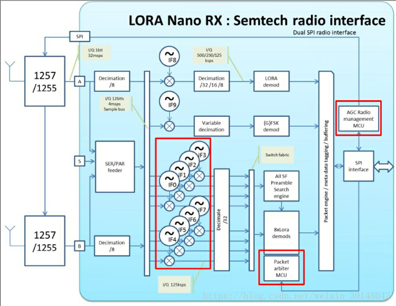 LoRaWAN网关SX1301:(8通道的LoRa接口用于LoRa节点的接入、一个FSK接口用于FSK节点的接入、1个LoRa网关间通讯的接口)